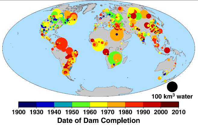 Most of the world’s biggest dams have been built since 1950, flooding river valleys with giant man-made lakes. The cumulative effect of all this water storage has been to skim about 1.18 inches off the top of Earth’s oceans.