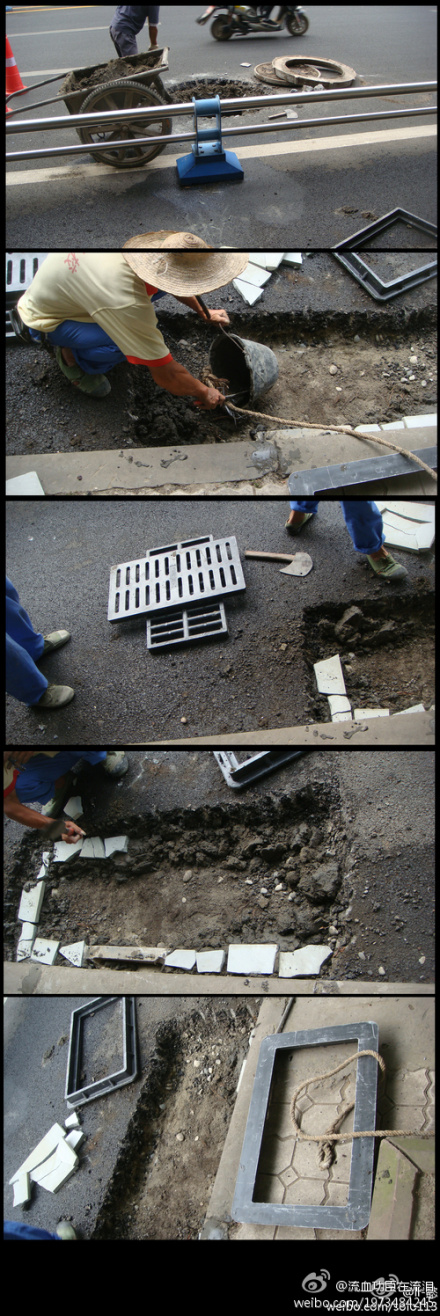 August 24: Due to poor urban drainage systems, Beijing, Nanjing, Wuhan and other cities were flooded following torrential rains this summer. Netizens made fun of the flooding via sentences like: “Please come to my office in Beijing to see the sea” … “Visit the waterfalls on the subway” … “I know now why we pay a vehicle and a vessel tax for our cars – cars are swimming in the water!” On August 21, a netizen had posted photos to a forum (subsequently forwarded by @流血功臣在流泪 on August 24) revealing a fake drainage infrastructure: “On Jinyuling road in Nanchong City, Sichuang province, workers are working on fake inspection shafts, which have no sewage disposal function.” 8月21日四川南充金鱼岭路,工人正在施工没有任何排水功能的假窨井……(以下略)