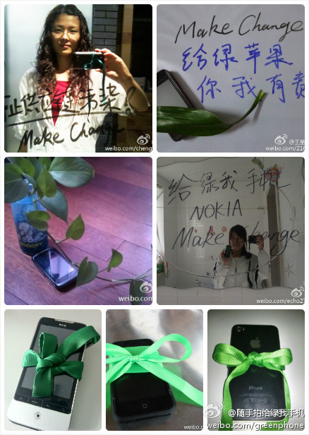 Chinese environmental groups have learned that factories supplying Apple are causing severe pollution. This has been widely covered by the media in the past few weeks. Indeed, compared with other brands of electronic goods, Apple has not responded well to concerns expressed by the Chinese public. So, netizens initiated a campaign on Weibo to urge the public to choose green products and to pressure companies to change. One Weibo account @随手拍给绿我手机, stated: “as an ordinary consumer, I urge all brand electronic companies to manage your supply chain well on our behalf. Protecting the environment is our common responsibility. Make Change!”