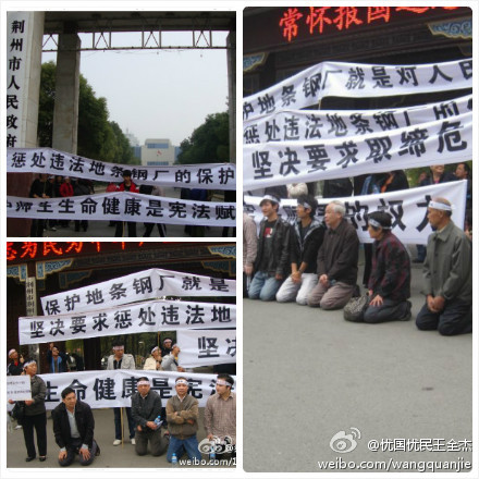 Later on, Wang Quanjie @忧国忧民王全杰 added the local authority’s response: “On November 4th, Mr. Chen, director of the Jinzhou district Propaganda Department, said that in the government’s drive to recruit investments, these small scale steel factories had met all the required rules. Moving the steel factories would not solve the problem. It is better to move the university out of this district. He promised to enhance environmental monitoring of big steel factories.” 【面对教授之跪】4日荆州区委宣传部陈主任称,小钢厂是招商项目手续齐全,搬迁钢厂解决不了问题,最好能将大学搬走。并承诺“政府将加大钢厂环境监管力