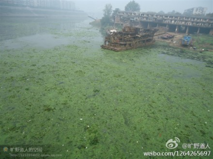 In a movement that has become known as Xiang River Watcher, Green Hunan’s volunteers @绿色潇湘 have been working with the media and doing a wonderful job to monitor the Xiang River. Though their work is noble, they usually find sad situations. More and more photos and videos taken by Green Hunan’s volunteers are alerting people to the Xiang River’s abnormal conditions. Here are two photos that they posted in October and early November of 2011. Many segments of the Xiang River and its tributaries are covered by trash, water hyacinth, and duckweed.