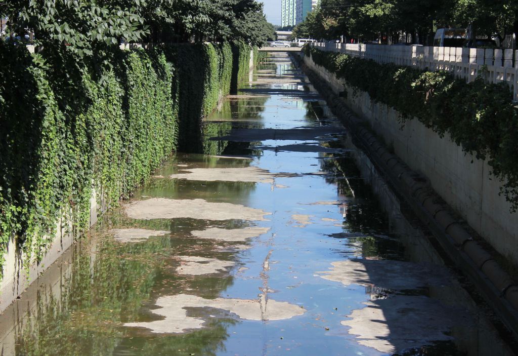 “That’s a river?” the man asks, and offers directions to what he says is a nearby ditch that sometimes puddles. After a few minutes, the Green Earth Volunteers arrive at a narrow canal holding a few centimeters of water. The bed of the Wanquan, which means “ten thousand springs,” is now paved over with concrete, the result of attempts to keep water from soaking into the ground when the canal was full. A pipe, once used to carry water into the small river, lies exposed to the sun, as do patches of dry ground. Ivy creeps along the sides of the canal, as if trying to reach what’s left of the water.