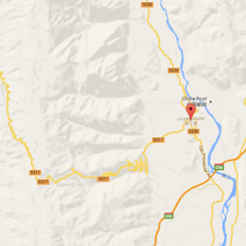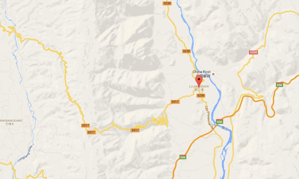 Map 1: The Lujiangba Township, of which Xinzhai Village is a part, is located between the Salween River and Gaoligongshan Mountain. See the zigzag mountain road to the west that runs through Gaoligong. (Google Map)