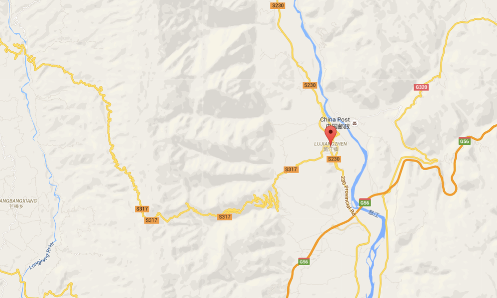 Map 1: The Lujiangba Township, of which Xinzhai Village is a part, is located between the Salween River and Gaoligongshan Mountain. See the zigzag mountain road to the west that runs through Gaoligong. (Google Map)