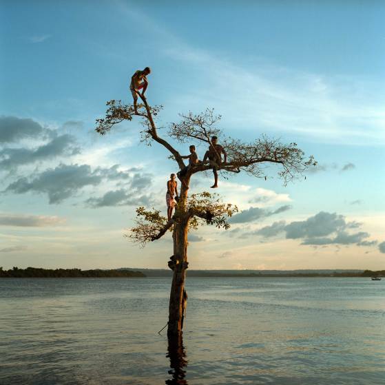 March 29, 2014. A group of boys climb a tree on the Xingu River by the city of Altamira, Brazil. One third of the city will be permanently flooded by the nearby Belo Monte Dam. Aaron Vincent Elkaim.