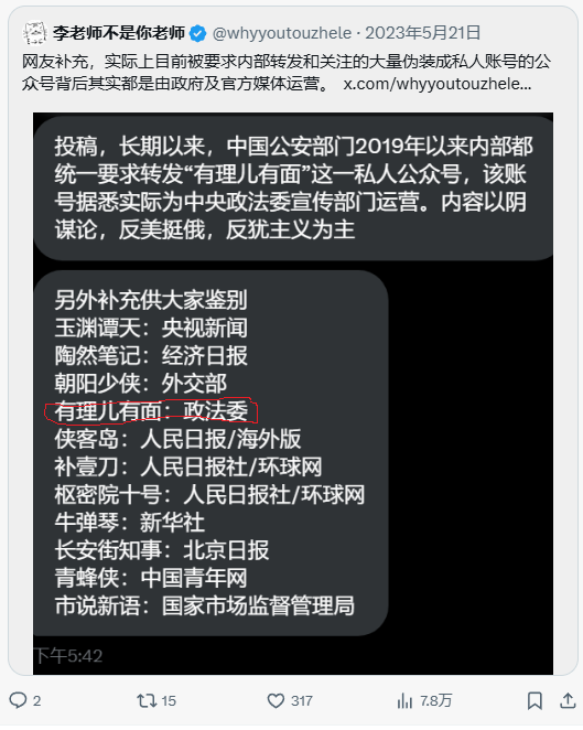 Since 2019, China’s public security departments have reportedly been instructed to consistently share content from a so-called private WeChat public account called Youli-Youmian (‘Reasonable and Respectable’). This account is believed to be operated by the Central Political and Legal Affairs Commission. Its content largely focuses on conspiracy theories, anti-American and pro-Russian narratives, and elements of antisemitism.” [Youli-Youmian is outlined in red below].