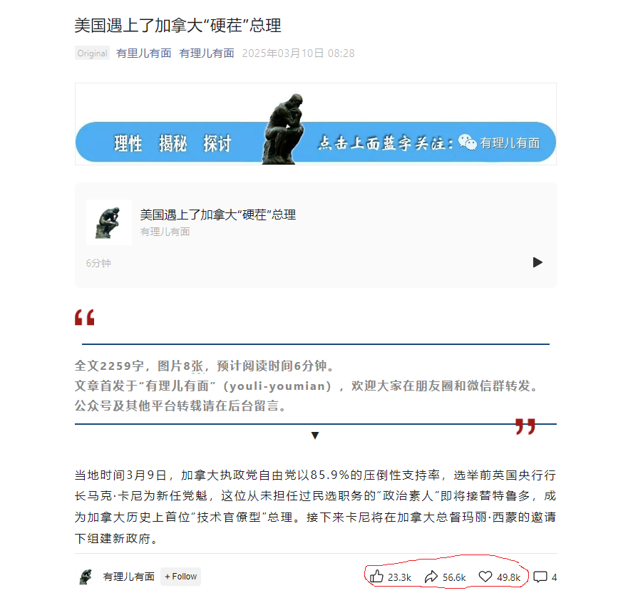 In its assessment, the SITE Task Force found the Carney-related articles circulated on WeChat via Youli-Youmian garnered 85,000 to 130,000 interactions, and an estimated 1-3 million views. By comparison, SITE found posts by China’s flagship state media, such as the People’s Daily, typically received only around 30,000 interactions. This significantly higher engagement highlights the effectiveness of the amplification tactics used, indicating the operation successfully reached a broad audience on the platform. SITE calculates the false election narratives were elevated to prominence, likely overshadowing organic news within Chinese-language Canadian communities during that period.