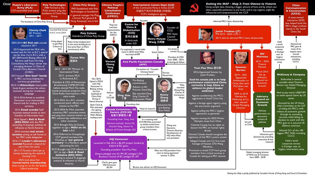 An intricate web of political and business ties between Canadian officials and Chinese state-linked entities is the focus of a new investigative map by diaspora researchers.