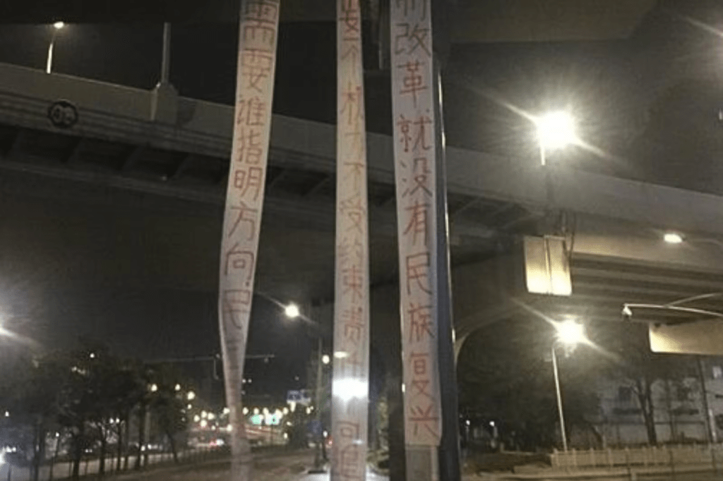The banners read: “Without political system reform, there will be no national rejuvenation,” “The people do not need a political party with unrestrained power,” and “China does not need anyone to point out the direction, democracy is the direction,” according to the X account, which is maintained by artist-turned-citizen journalist Li Ying and shot to prominence during the “White Paper” protests.