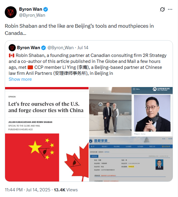 Reactions on social media to the Globe and Mail essay reflected Clarke and Glavin’s affront. China expert, Byron Wan, published a photograph of co-author Robin Shaban meeting Li Ying (李鹰), a member of the Chinese Communist Party and a partner at the Chinese law firm Anli Partners (安理律师事务所) in Beijing a month prior to the release of her article. Wan highlighted the Globe and Mail piece in his post to X [see below], adding the descriptor of Canada’s Beijing “tool” and “mouthpiece” for Shaban. The latter provided a most positive write-up of her meeting with Ying via her LinkedIn account, as well as tourist snaps taken during her trip to Beijing, including one of a visit to Tiananmen Square (the irony is bleak).