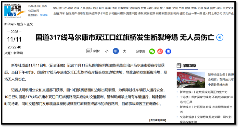 On November 11, 2025, at 8:22 p.m., Xinhua News Agency published a report by Wang Xi, a reporter from the Chengdu bureau, titled “The Hongqi Bridge at Shuangjiangkou, Ma’erkang City, on National Highway 317 Collapses. The report in “No casualties” [1] states: On November 11, reporters learned from the Publicity Department of the Ma’erkang Municipal Committee of Aba Tibetan and Qiang Autonomous Prefecture, Sichuan Province, that at around 4 p.m. that day, a landslide occurred on the right bank of the Hongqi Bridge at Shuangjiangkou, Ma’erkang City, on National Highway 317, causing the bridge to collapse. There were no casualties at the scene. Reporters learned from the Aba Prefecture Public Security and Transportation Departments that due to cracks appearing on the bridge surface and slope on the 10th, temporary traffic control was implemented on the Hongqi Bridge section of Shuangjiangkou, Ma’erkang City, on National Highway 317 on the 10th to ensure the safety of passing vehicles and pedestrians. During the control period, all vehicles are prohibited from passing through, and the time for lifting the control is yet to be determined. At the same time, the transportation department released a detour route from Rangtang County to Aba County to Hongyuan County to Chengdu City. The cause of the accident is currently under investigation.