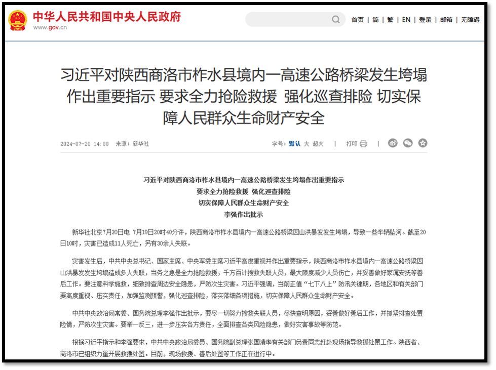 [5] Xi Jinping issued important instructions on the collapse of a highway bridge in Zhashui County, Shangluo City, Shaanxi Province, demanding all-out efforts in rescue and relief and strengthening of patrols and hazard mitigation. To effectively safeguard the lives and property of the people, on July 20, 2024. Source: Xinhua News Agency, published on the website of the Central People’s Government of the People’s Republic of China. https://www.gov.cn/yaowen/liebiao/202407/content_6963663.htm