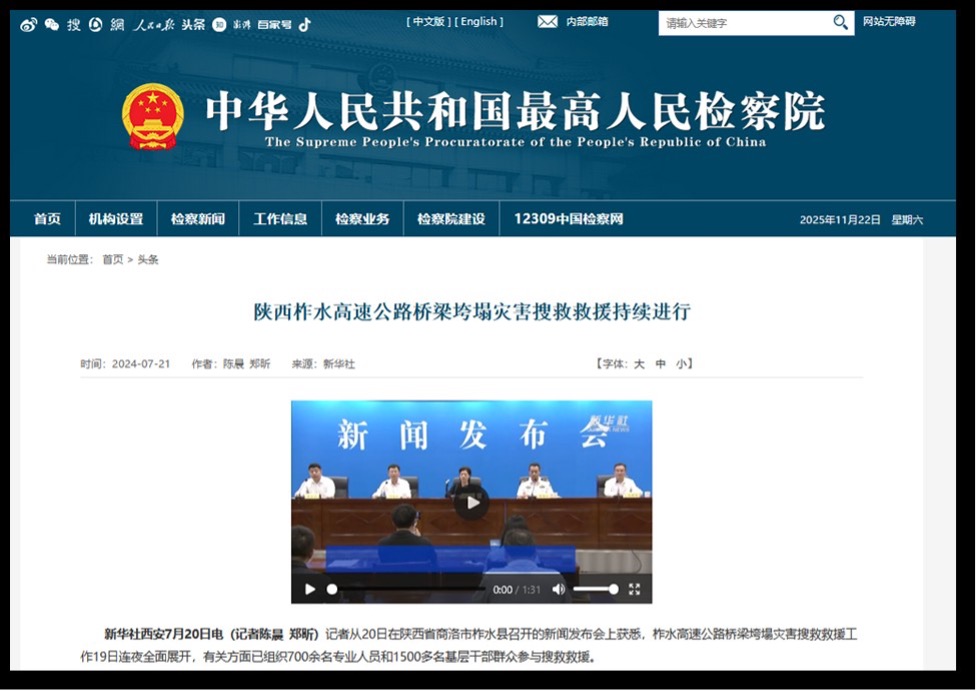 [7] Chen Chen, Zheng Xin: Search and rescue operations continue in the Zhashui Expressway bridge collapse disaster in Shaanxi Province. July 21, 2024. Source: Xinhua News Agency. Published on: Website of the Supreme People’s Procuratorate of the People’s Republic of China. https://www.spp.gov.cn/tt/202407/t20240721_660843.shtml
