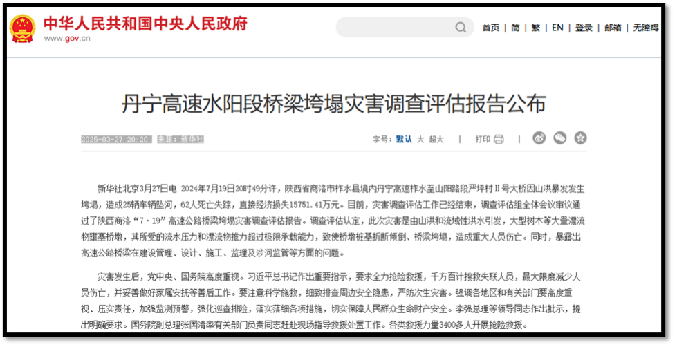 [8] The investigation and assessment report on the bridge collapse disaster on the Shuiyang section of the Danning Expressway was released on March 27 , 2025. Source: Xinhua News Agency, published on the website of the Central People’s Government of the People’s Republic of China. https://www.gov.cn/yaowen/liebiao/202503/content_7015907.htm
